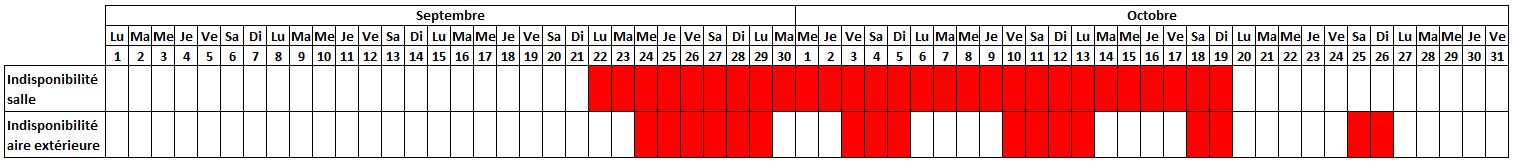 Planning indisponibilité salle & aire extérieure sept-oct 2025